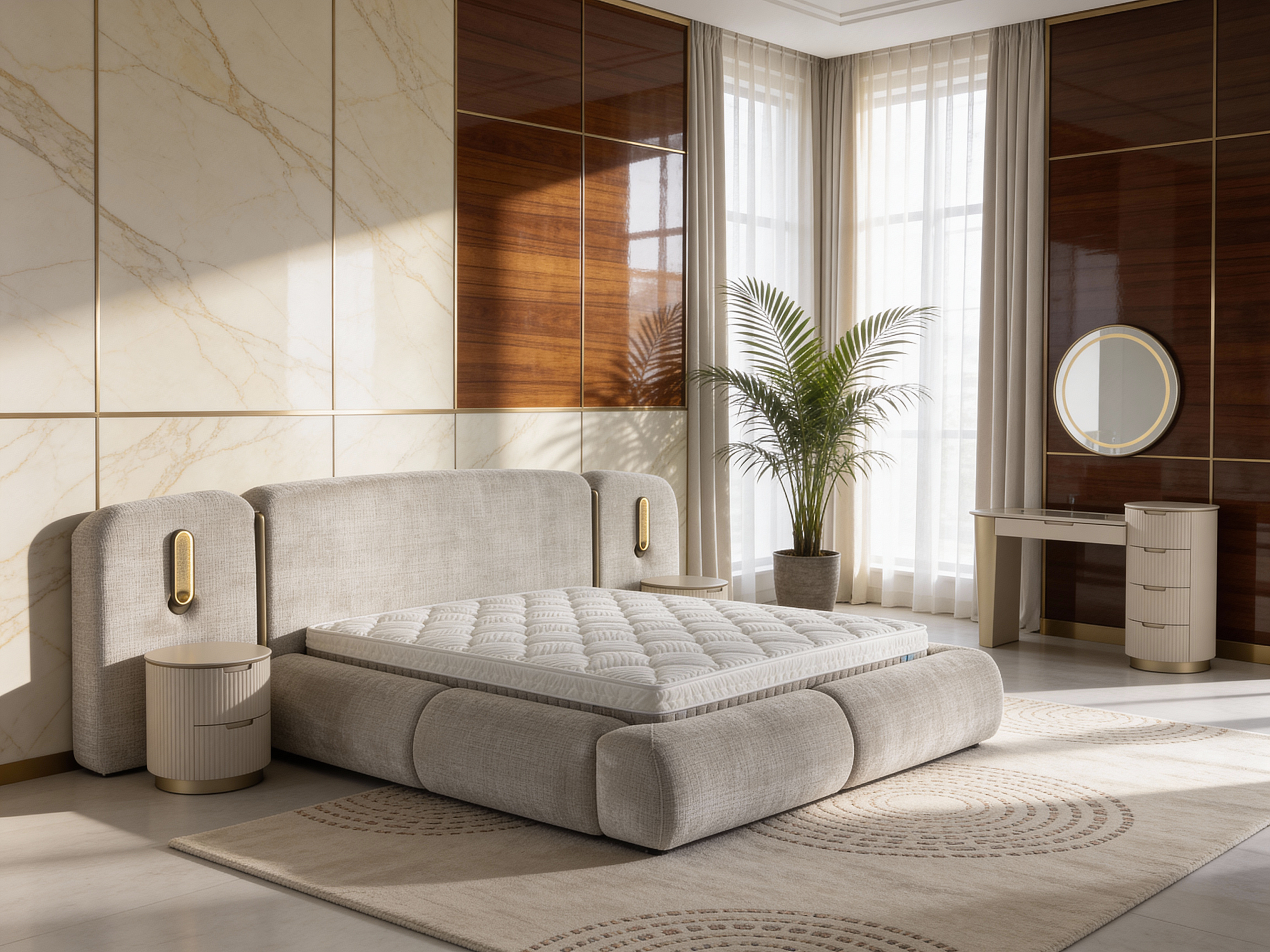Son revêtement en tissu doux et ses finitions soignées donnent au lit Armoni une apparence raffinée qui s’intègre facilement dans une décoration moderne ou minimaliste.