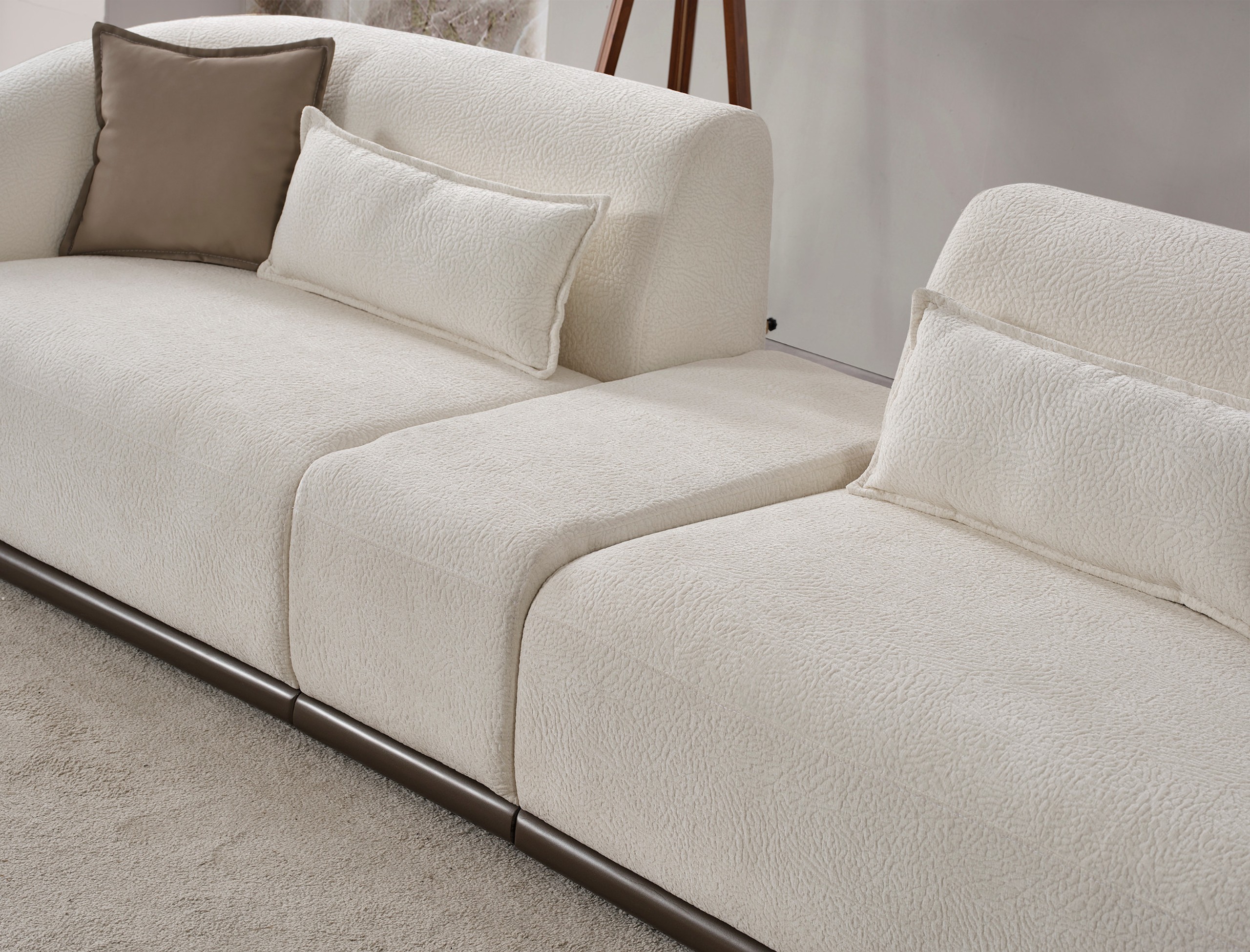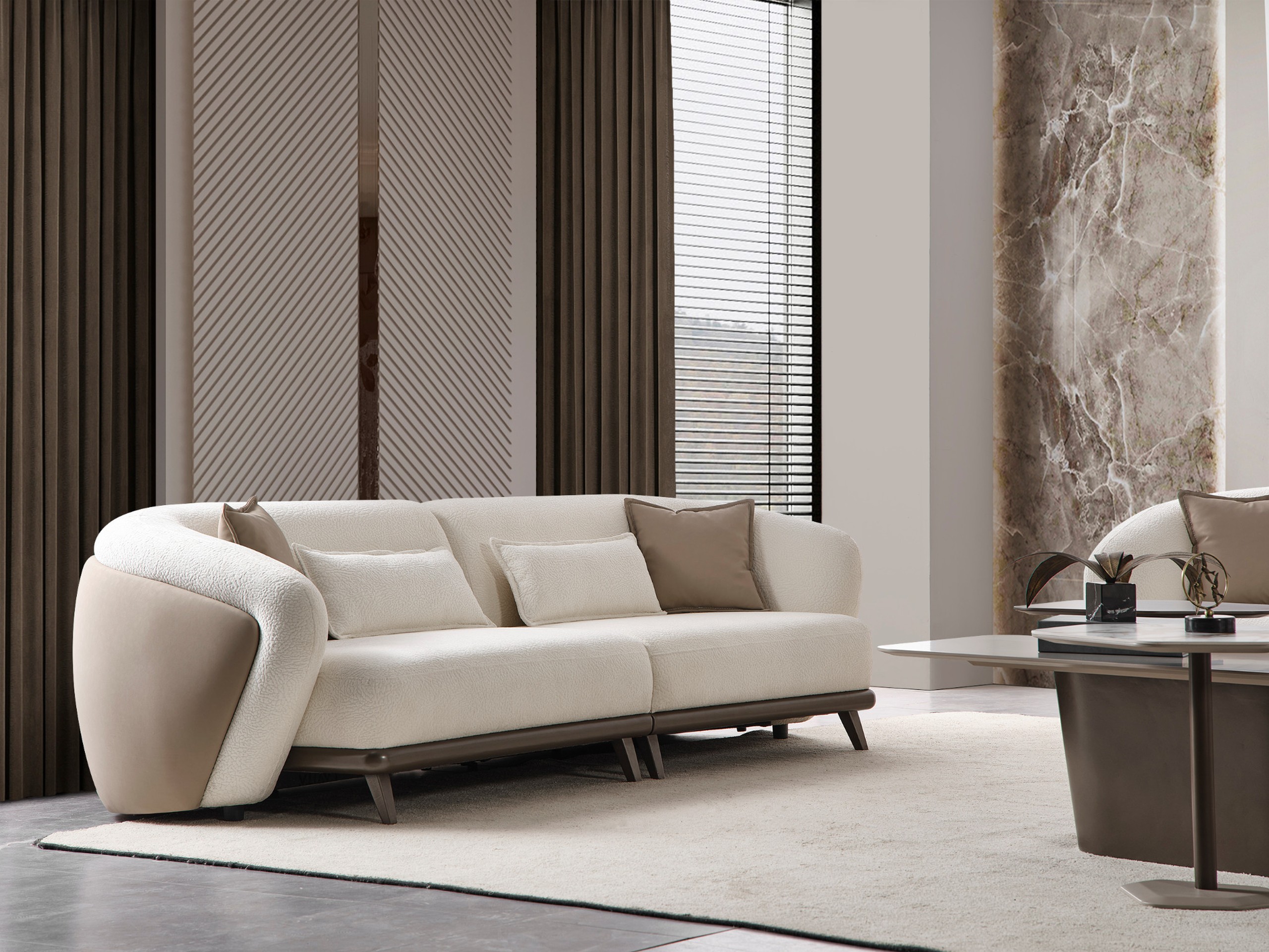 Le canapé Lattes se distingue par son design audacieux et contemporain, mêlant subtilement lignes arrondies et finitions élégantes. Son style unique, avec contraste de matières et formes enveloppantes, apporte une véritable signature décorative à votre salon.