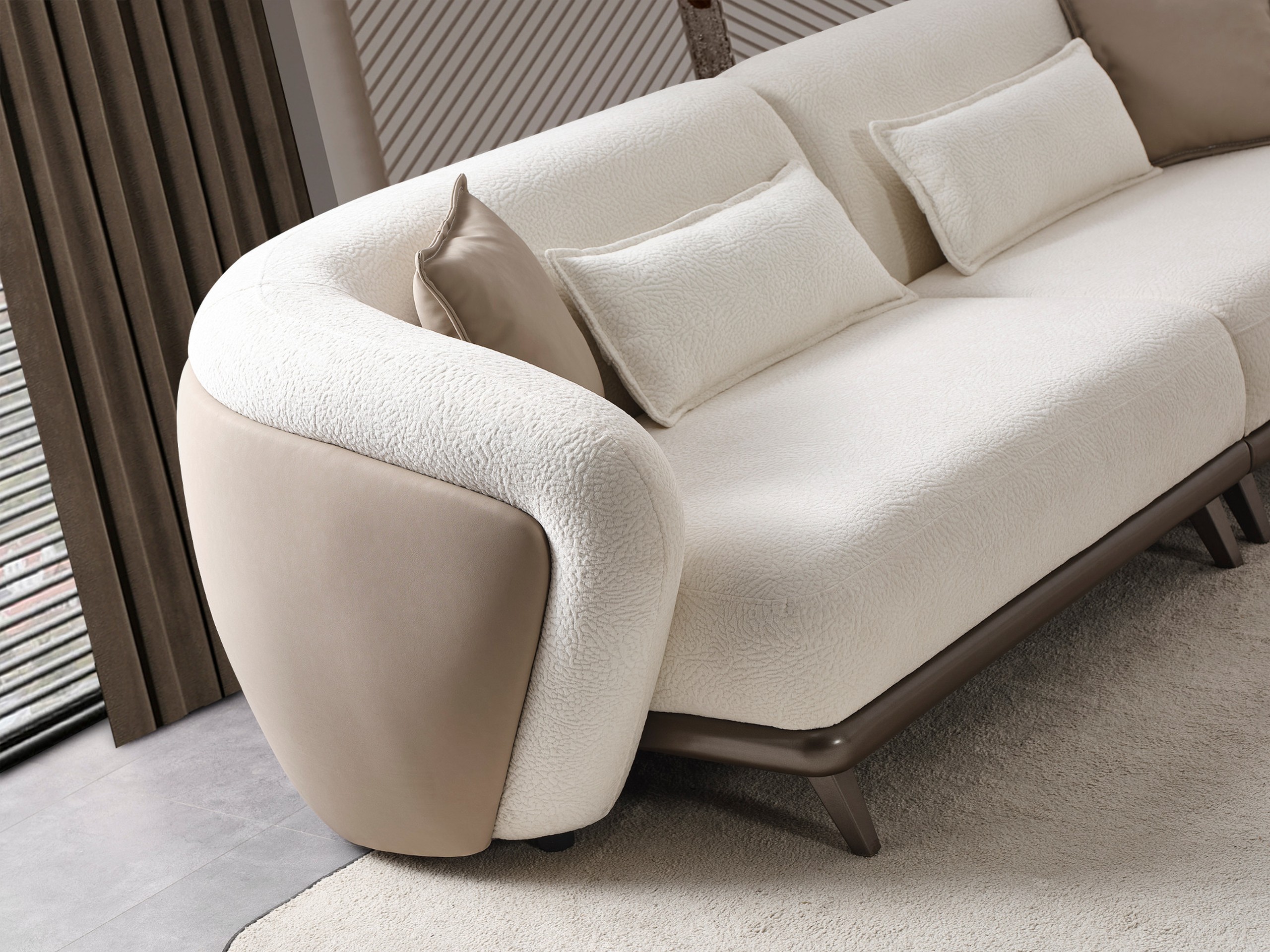 Ses assises larges et ergonomiques offrent un confort exceptionnel, parfait pour des moments de détente prolongés. Le revêtement en tissu bouclé doux, associé à des éléments aux finitions plus lisses, crée un jeu de textures raffiné et moderne.