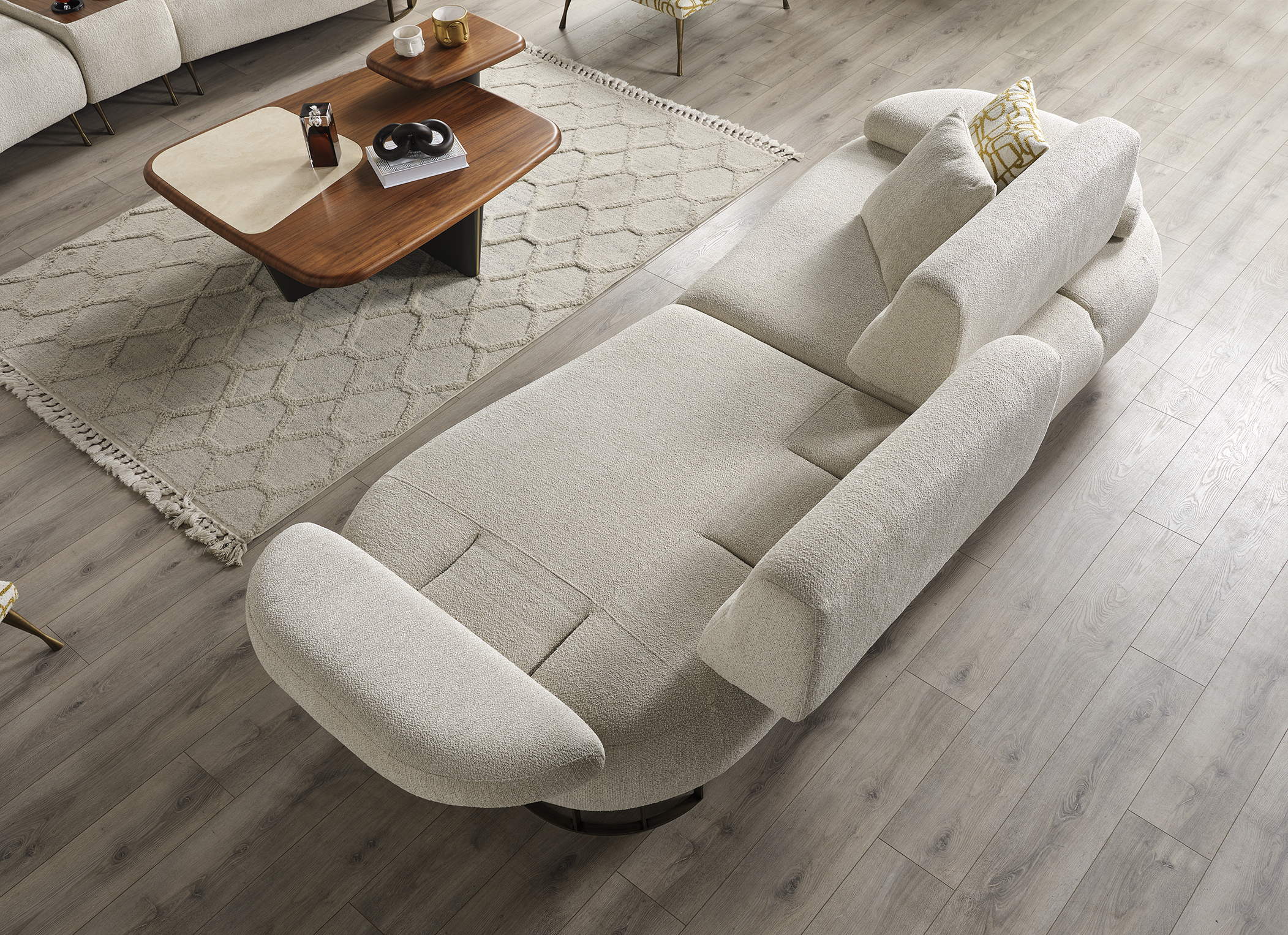 Son design tout en courbes, associé à une assise généreuse et des dossiers moelleux, offre un confort optimal au quotidien. Les accoudoirs intégrés et ses proportions équilibrées créent une silhouette harmonieuse, à la fois accueillante et sophistiquée.