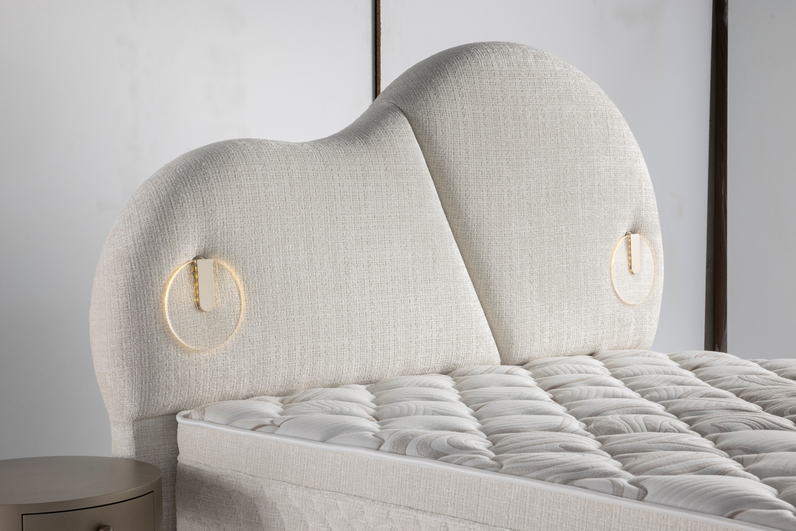 Apportez élégance et confort à votre chambre avec le modèle Mirella, un lit boxspring au design moderne et raffiné. Sa tête de lit au style contemporain se distingue par ses courbes élégantes et ses deux lampes LED intégrées, idéales pour créer une ambiance chaleureuse et pratique pour la lecture.