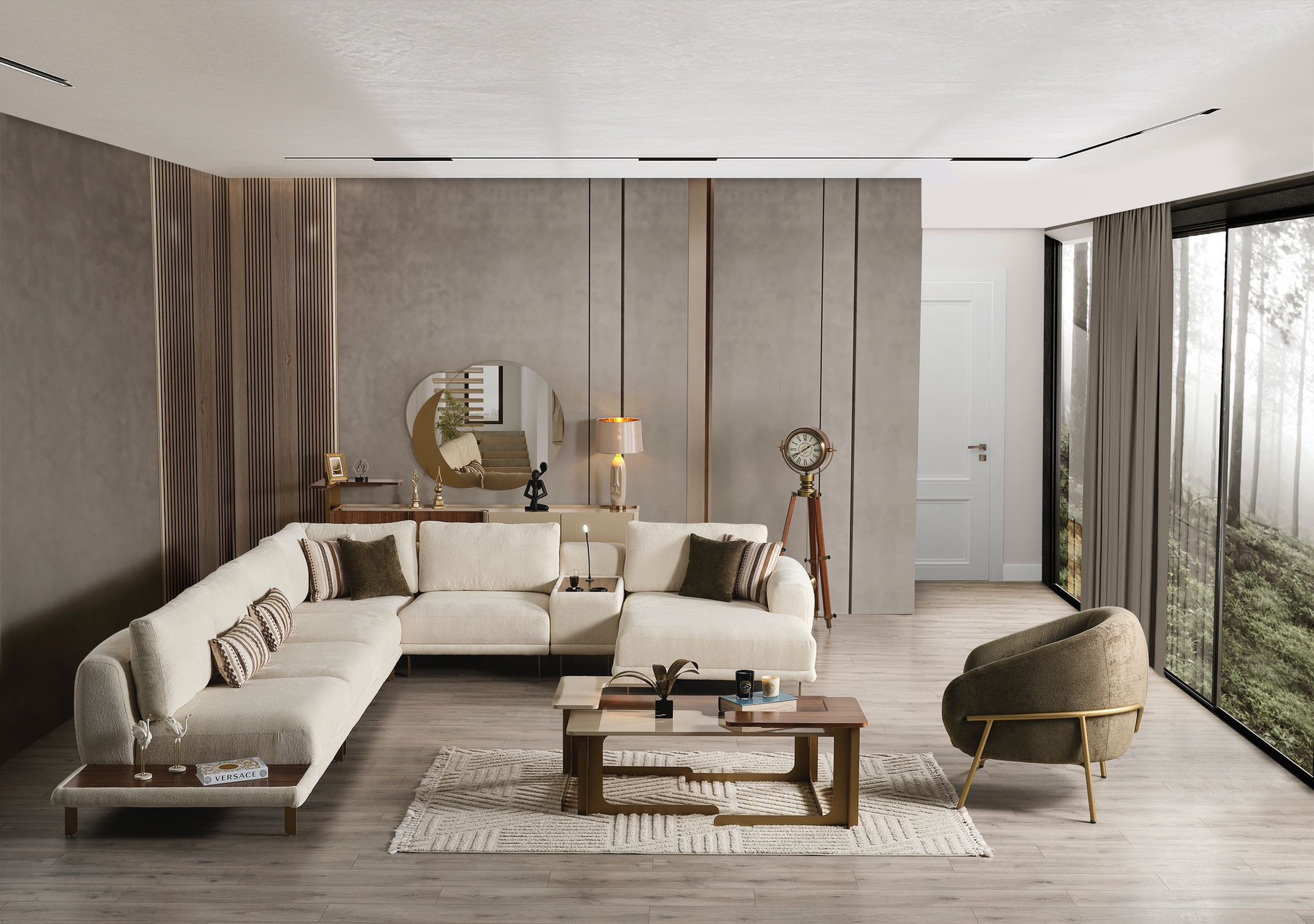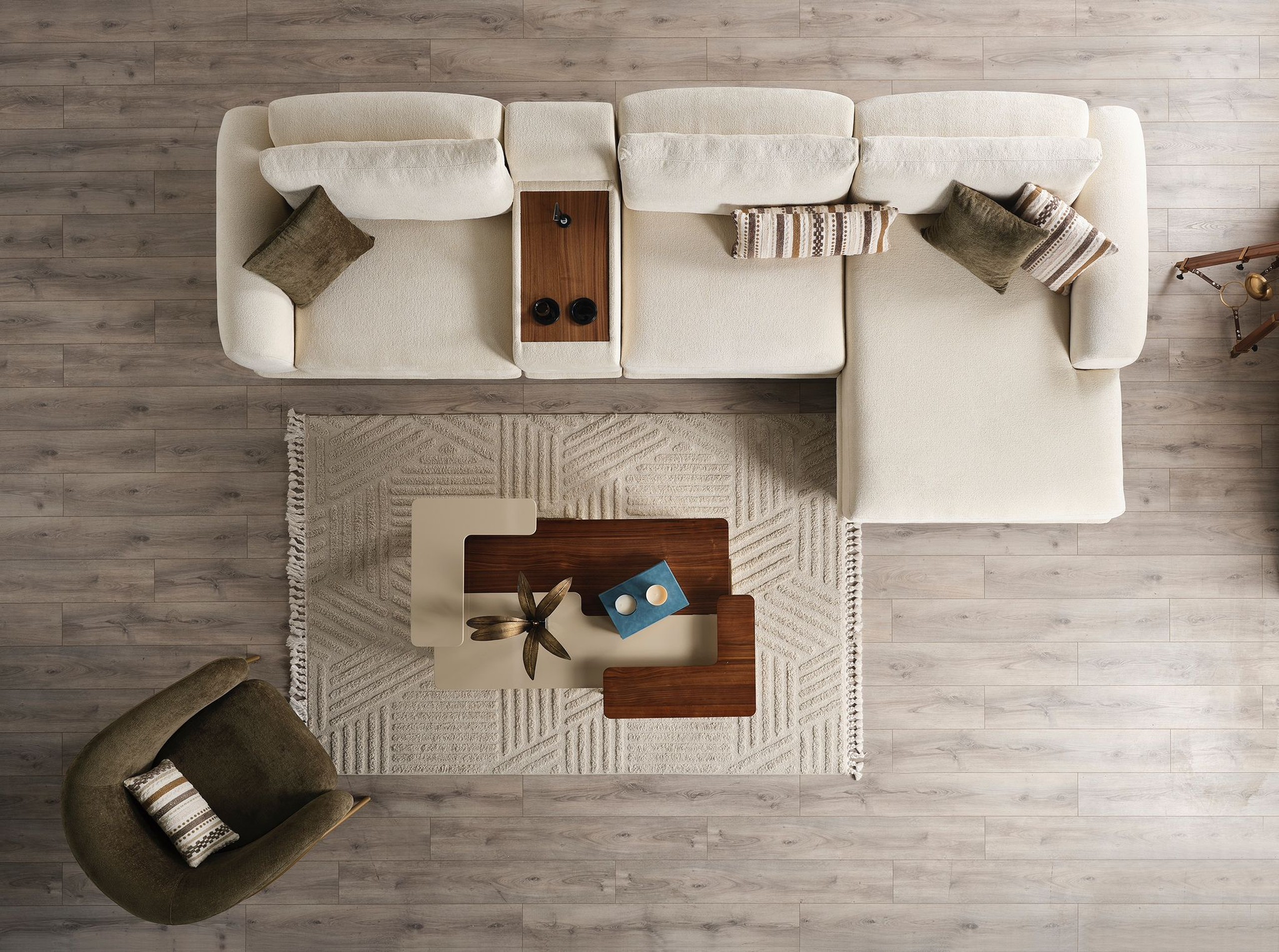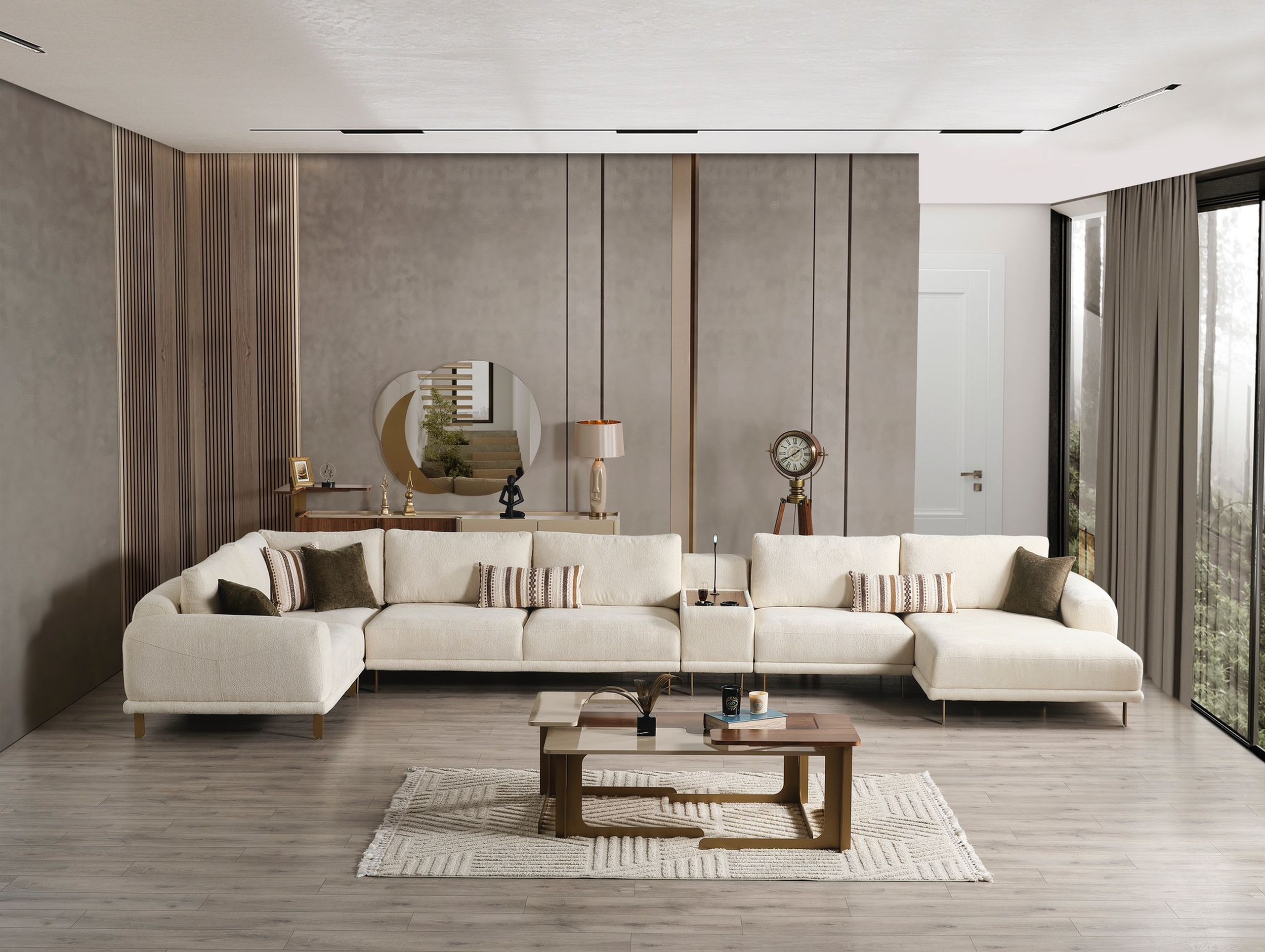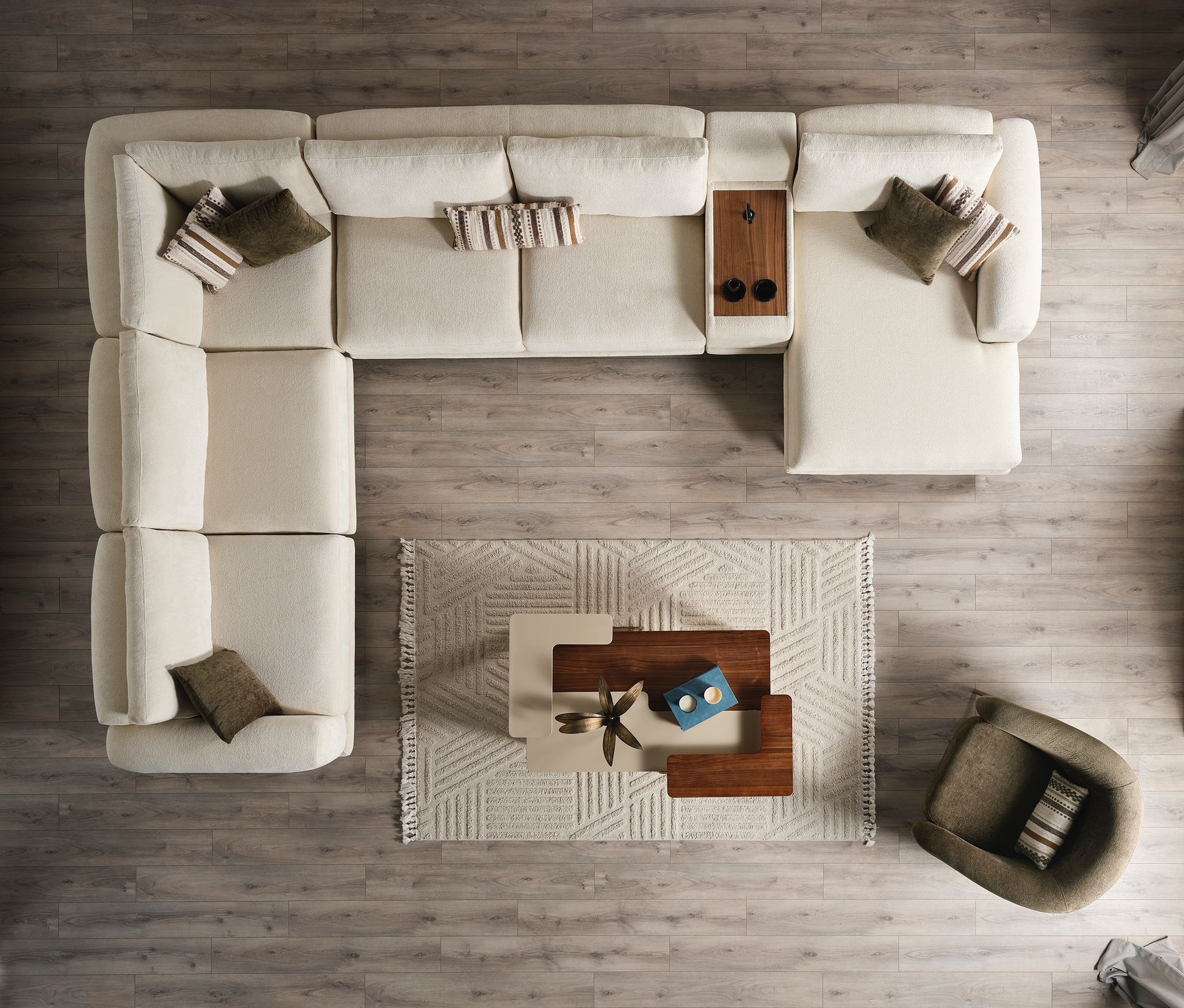 Ses assises larges et profondes assurent un confort optimal, tandis que son revêtement en tissu doux apporte une sensation chaleureuse et agréable au toucher. Les coussins décoratifs aux tons naturels viennent sublimer l’ensemble avec une touche sophistiquée.